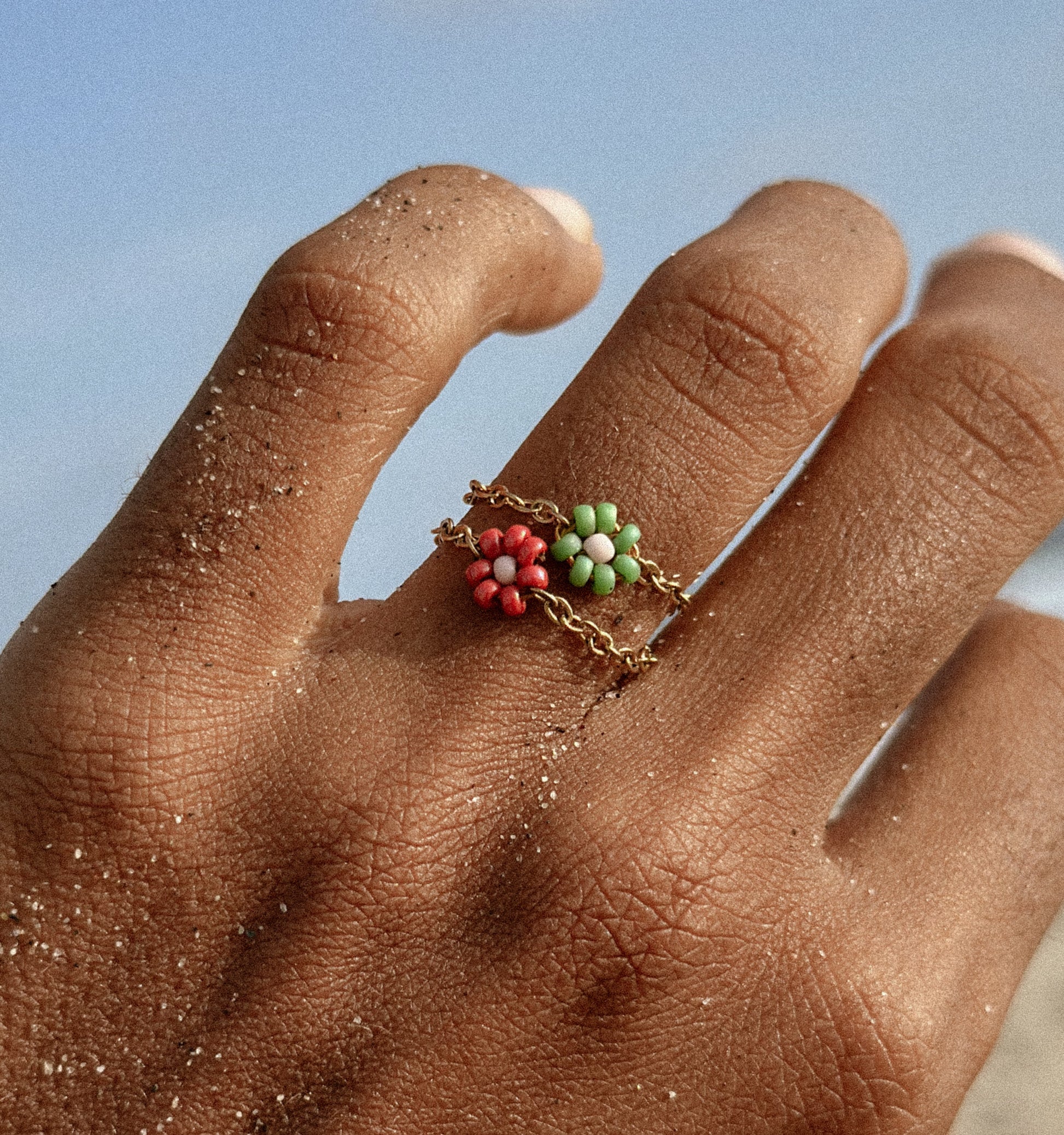 Nuestro best-seller, el anillo Flora, compuesto por una fina cadena dorada y una pequeña flor de perlas, conquista por su delicadeza. Disponible en varios colores, se adapta a tu outfit según tu estado de ánimo.