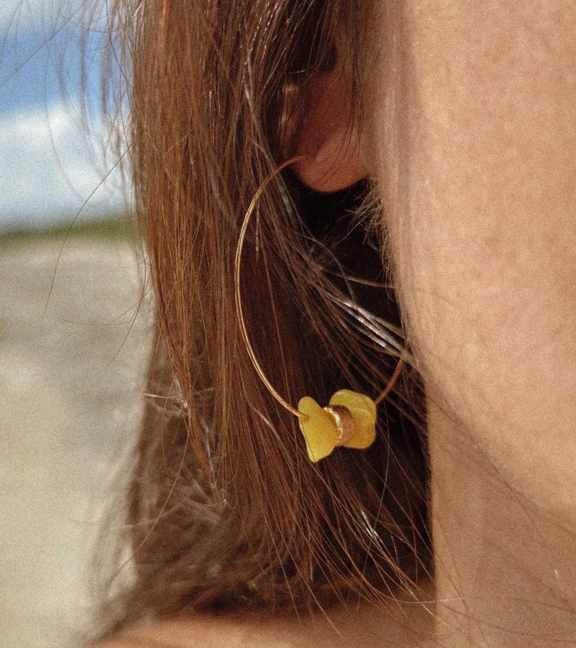 Olivia son unos aretes tipo aro elegantes, realzados con una perla dorada rodeada por dos perlas de jade amarillo.