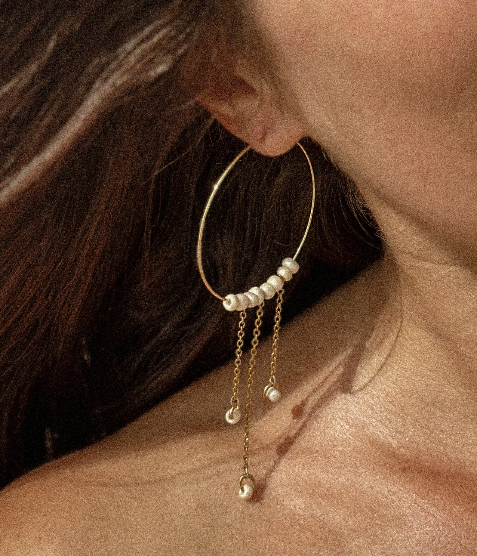 Novedad de la colección: los aretes Vicky, con su gran aro dorado y sus perlas blancas, no pasan desapercibidos.