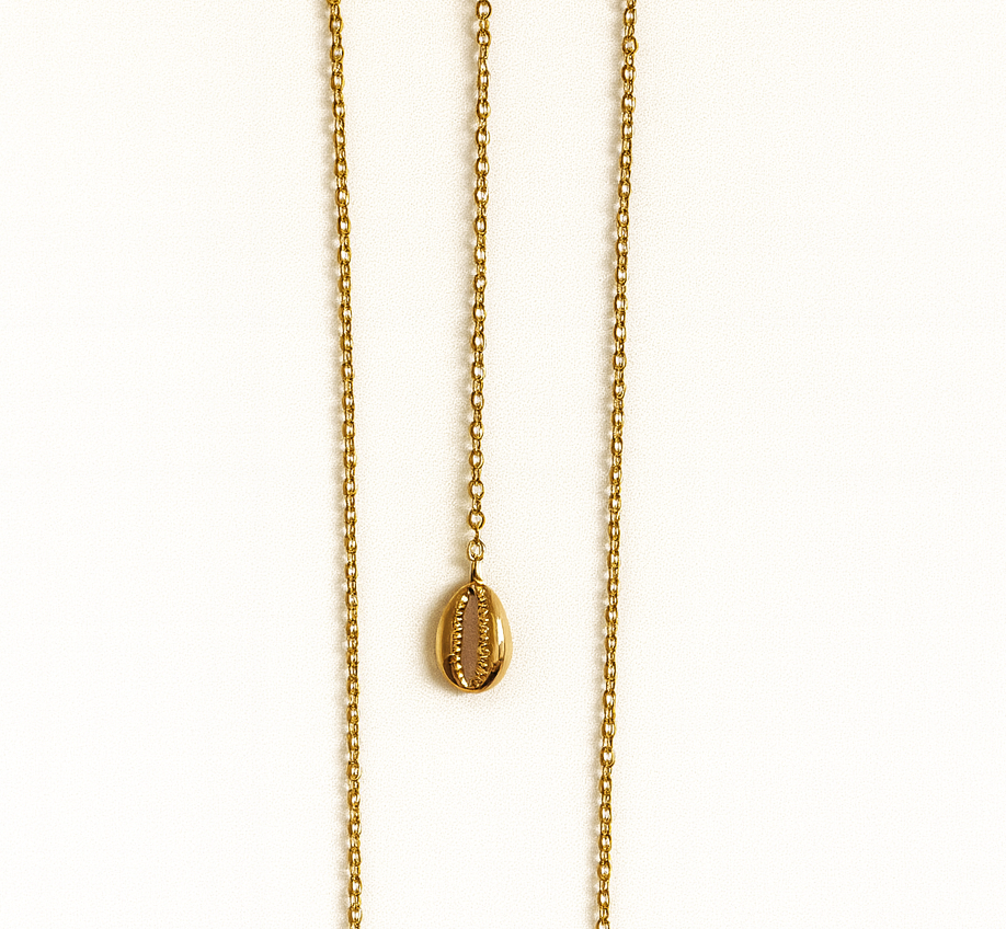 Está compuesta por una fina cadena dorada, una hilera de perlas blancas delicadamente colocadas a la altura del cuello y un colgante de concha dorada que cae con elegancia sobre el pecho.