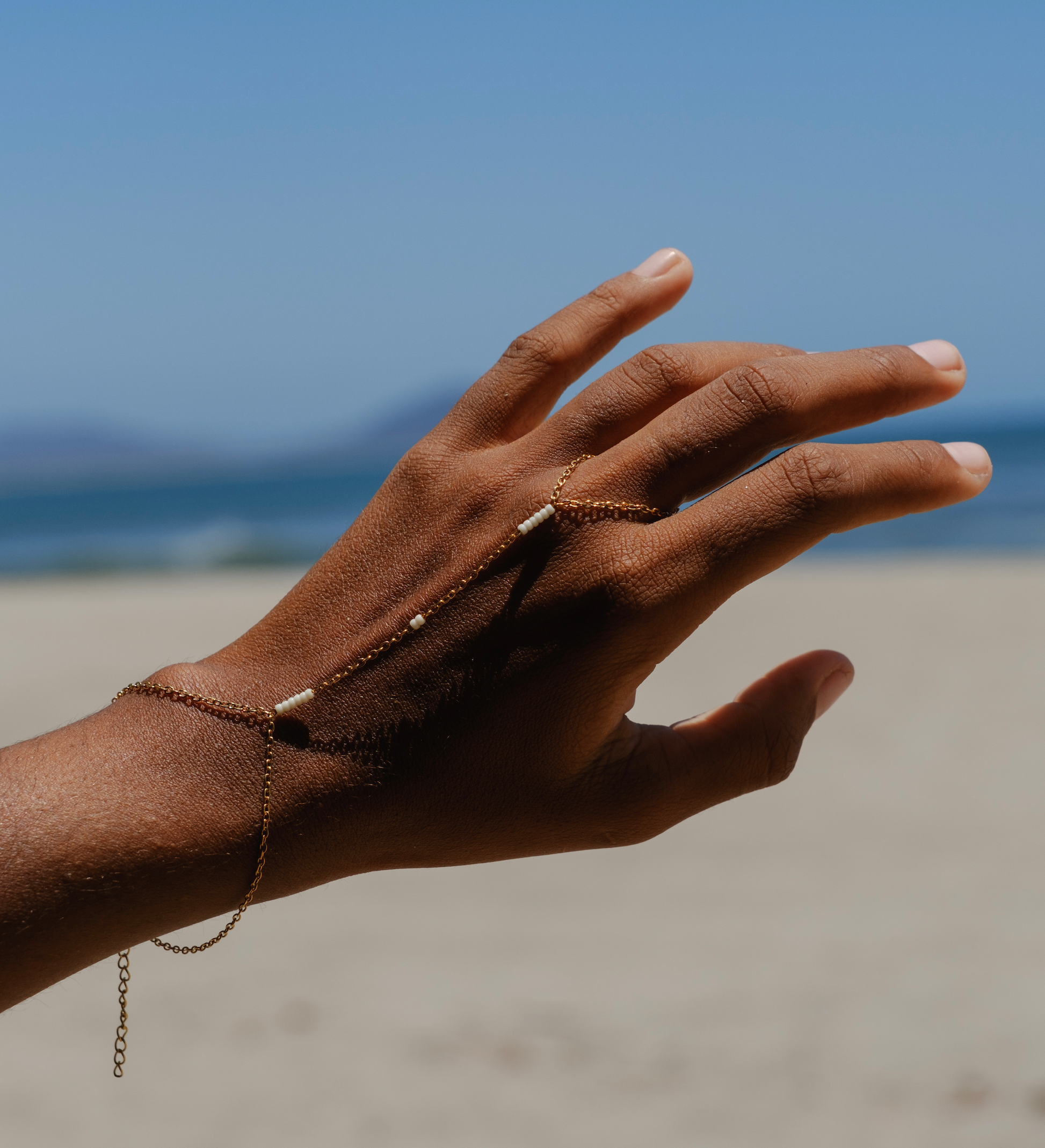 Sencillo pero lleno de encanto, el accesorio de mano Sandra adorna delicadamente la mano con su fina cadena dorada y su línea de cuentas blancas de rocalla.