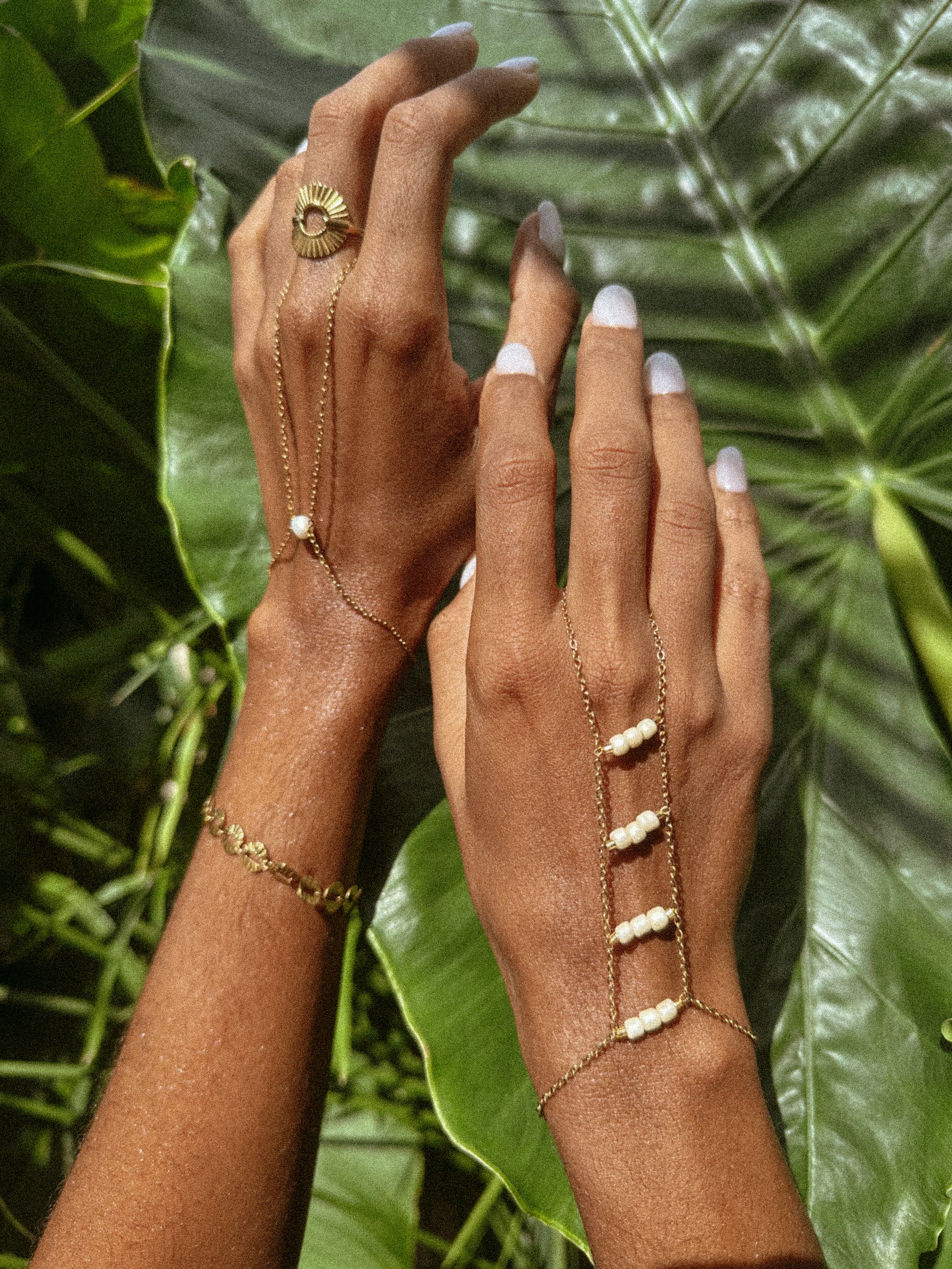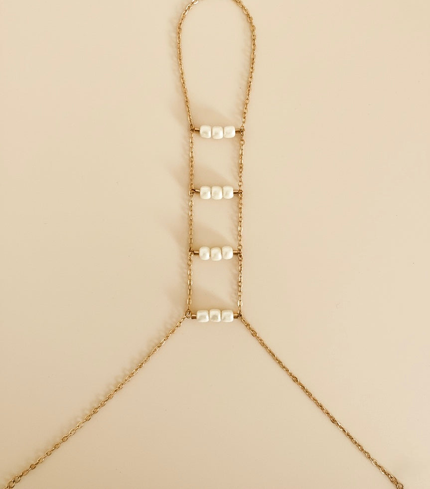Una cadena dorada que envuelve la mano, decorada con hileras de perlas blancas nacaradas.